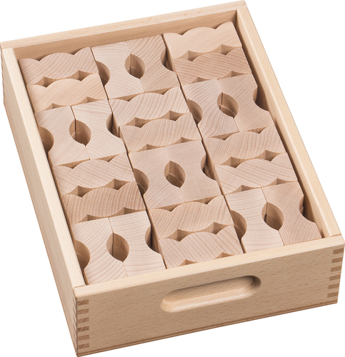 Съдържание/ материали / размери: 96 орнаментални строителни блокчета в две различни форми (влизат едва в друга), изработени от масивна дървесина. Съхраняват се в дървена кутия с размери 30х28х8,5 см.