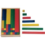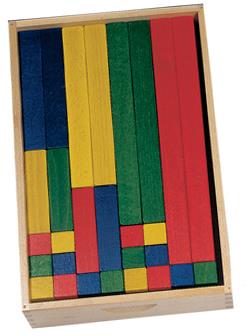 Съдържание/ материали / размери: 112 дървени строителни блокчета с различни форми и размери в 4 цвята (червено, синьо, жълто и зелено). Съхраняват се в дървена кутия с размери 47х30х8,5 см.