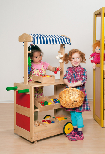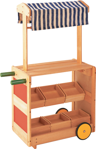 Подвижен детски пазарен щанд. Големите колела и дръжки улесняват преместването.