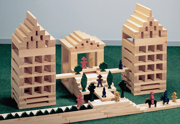 Съдържание/ материали / размери: 60 бр. строителни блокчета от необработена масивна дървесина с размери 24х4,8х1,6 см. Опаковка: картонена кутия.