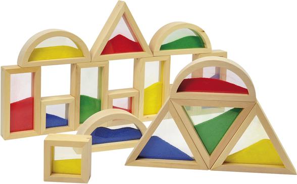 Дървени строителни блокчета с прозрачни акрилни страни и пълнеж от цветен пясък. Децата могат да правят различни експерименти и чрез играта да опознаят статиката и силата на гравитацията.