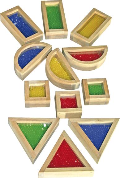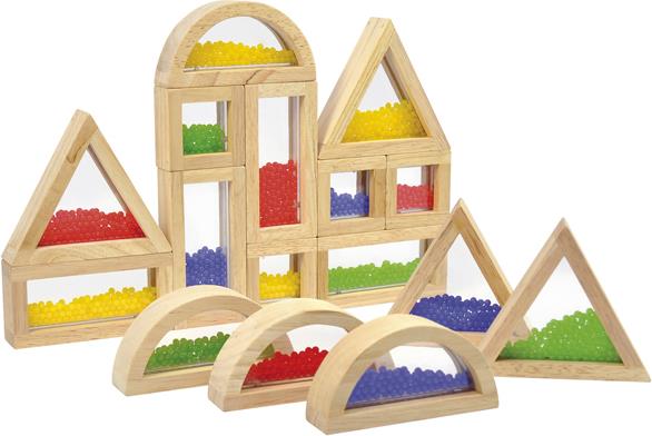 Дървени строителни блокчета с прозрачни акрилни страни и пълнеж от цветни мъниста. Децата могат да правят различни експерименти и чрез играта да опознаят статиката и силата на гравитацията.