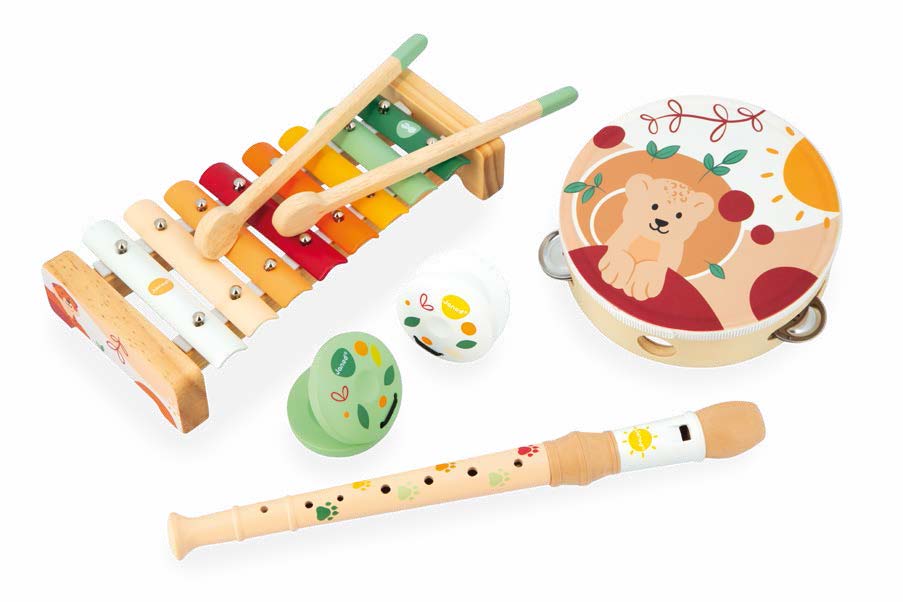 Комплект детски дървени музикални инструменти. Включва: 1 х флейта (3х3х31 см) 2 х кастанети (диам. 5,9 см) 1 х дайре (диам. 15 см) 1 х метален ксилофон (25х12х4,5 см)