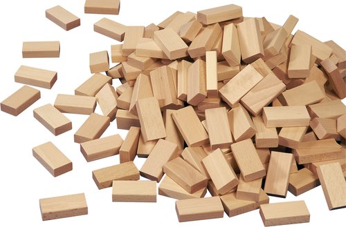Съдържание/ материали / размери: Опаковка от 5 кг. (около 195 бр.) правоъгълни дървени строителни блокчета с размери 66,6х33,3х16,7 мм.