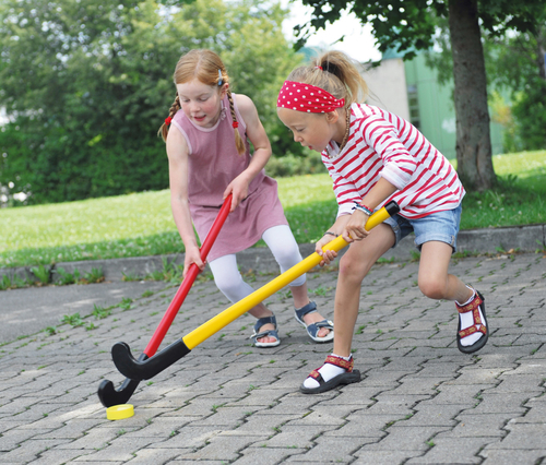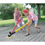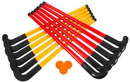 Комплект стикове и топки за детски хокей на трева. Може да се използва на открито и закрито. Съдържание / Материал: комплект от 6 червени и 6 жълти стика, 3 топки; стиковете са изработени от пластмаса с гумен накрайник Размери: 90 см, 375 гр.
