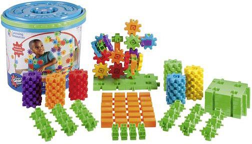 Детски конструктор с цветни зъбни колела, свързващи елементи и базови плочки. Комплектът дава безброй възможности за изобретяване на триизмерни, движещи се конструкции. Частите се съхраняват в голяма кофа.