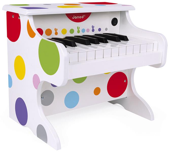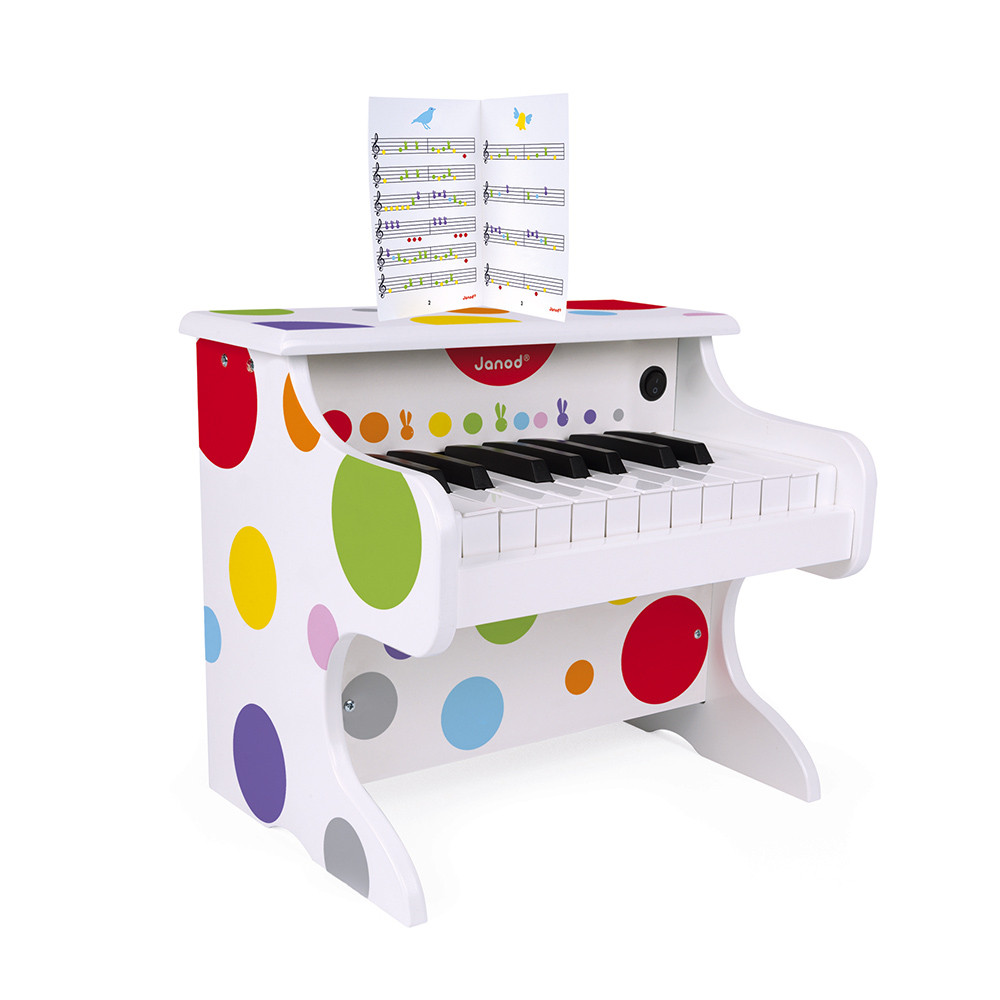 Детско дървено пиано, с което малките деца ще открият удоволствието от свиренето и музиката. Осигурени са четири партитури с цветна кодировка. Разбира се, детето ще може да създава и своя собствена музика според въображението си благодарение на 18-те клавиша, които издават различен звук. Практично, пианото автоматично се изключва след 2 минути, ако детето вече не играе с него. Работи с 4 батерии LR03 1.5V, които не са включени.
