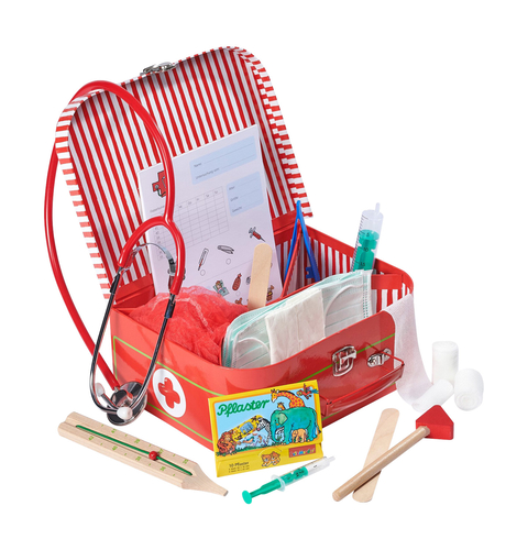 Съдържание: 21 елемента – различни видове превръзки, 2 спринцовки, лепенки, 4 предпазни масти, картон с история на заболяването и рецептурник, термометър, стетоскоп, пинсета, чукче, 4 предпазни шапки, шпатули, в практично куфарче