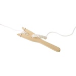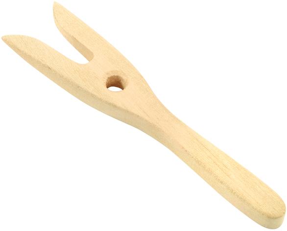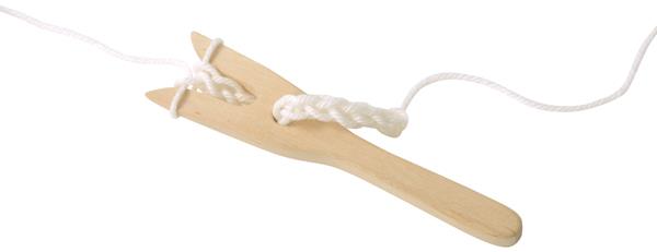Вълнената прежда се усуква около зъбците на вилицата под формата на осморка и се издърпва с пръст. По този лесен начин децата мога да правят гривни, шнурчета за мартенички, коланчета и т.н. Материал: дърво Дължина: 16 см