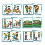 Съдържание на комплекта „Добро поведение в училище“: 34 карти с цветни изображения, представящи 17 двойки противоположни поведения