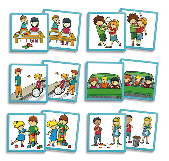 Комплектът „Добро поведение в училище“ е създаден, за да помогне на децата да разпознават и разбират разликата между положителното и отрицателното поведение в училищна среда. Чрез игра с карти, представящи различни ситуации, малчуганите ще се научат да идентифицират правилните и неправилните действия, което ще подпомогне тяхното социално и емоционално развитие.