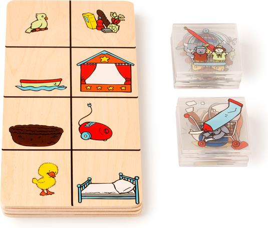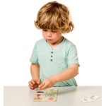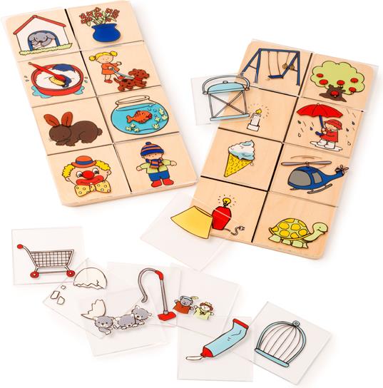 Открийте коя от прозрачните карти с изображения допълва най-правилно картинка от дървените плочки. Поставете я върху нея, за да проверите дали е правилно! Опишете какво виждате!