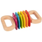 Тази цветна сензорна играчка от дърво комбинира зрителна, слухова и тактилна стимулация. При стискане и движение дъговите елементи леко се разместват и издават мек, успокояващ звук, който насърчава вниманието и концентрацията. Формата с две дръжки е удобна за захващане с две ръце и стимулира координацията и ритмичните движения, подпомагащи фината моторика и общата моторна организация.