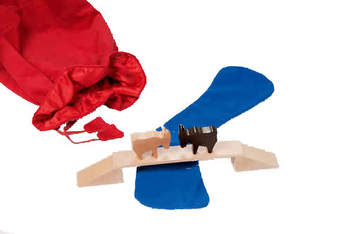 Съдържание: 4 части: 2 козлета, 1 мост от дърво, 1 река от плат. Доставя се в кадифена торбичка