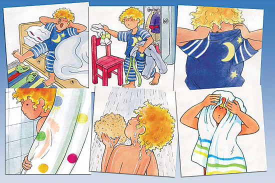 Съдържание: Игра с карти, представящи серия от повтарящи се дейности в ежедневието – от ставане от сън сутринта до заспиването вечер. Изображенията предлагат различни възможности за дискусии и сравнения. Главният герой е дете, което може да бъде момче или момиче, а след това всички деца могат лесно да се идентифицират с героя. Картонена кутия със 75 цветни изображения, ръководство.