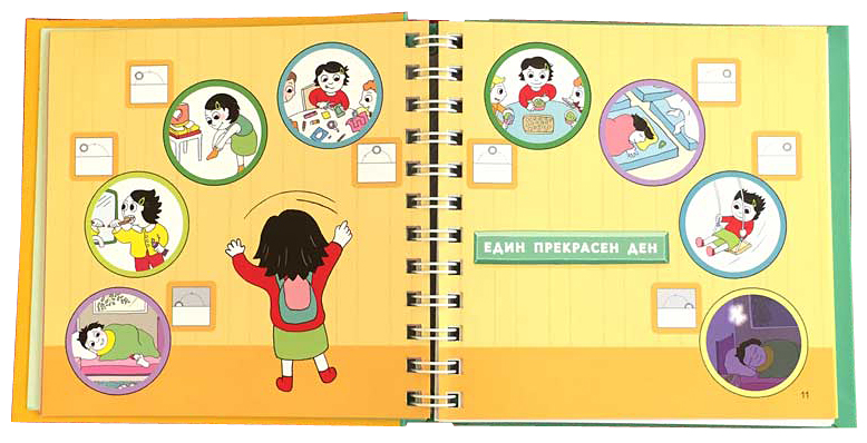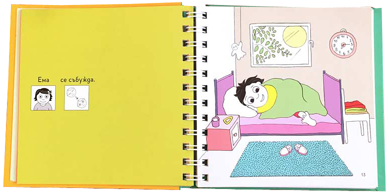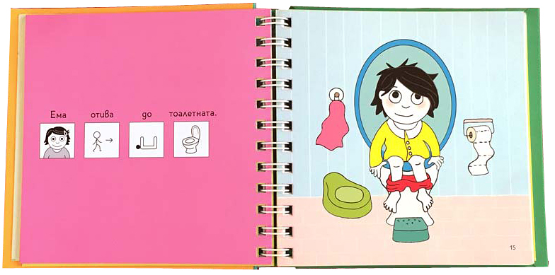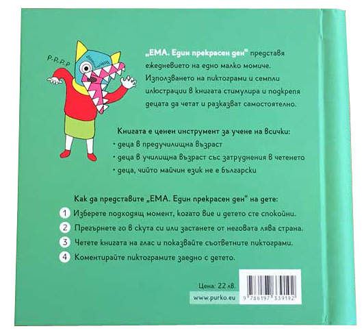 Използването на пиктограми и семпли илюстрации в книгата стимулира и подкрепя децата да четат и разказват самостоятелно.