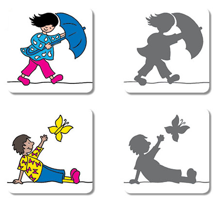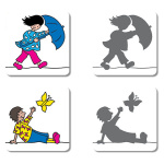 Съдържание: 24 цветни карти (размер 7,5 x 7,5 см); Една фигура и сянката към нея образуват чифт карти • Инструкции.