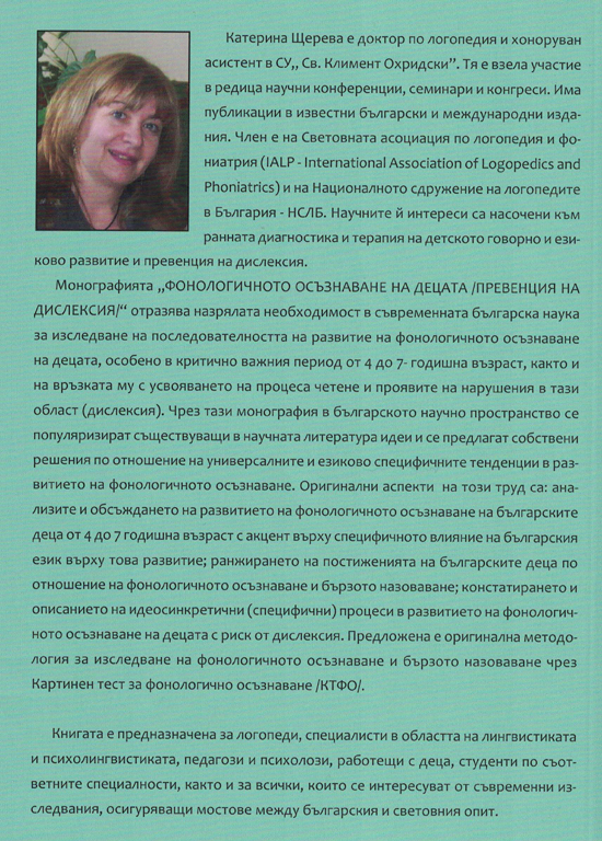 Монографията „Фонологичното осъзнаване на децата /превенция на дислексия/“ отразява назрялата необходимост в съвременната българска изследователска наука за изследване на последователността на развитие на фонологичното осъзнаване, особено в критично важния период от 4 до 7-годишна възраст, както и на връзката му с усвояването на процеса четене и с проявите на нарушения в тази област (дислексия). Чрез тази монография в българското научно пространство се популяризират съществуващи в научната литература идеи и се предлагат собствени решения по отношение на универсалните и езиково специфичните тенденции в развитието на фонологичното осъзнаване. Оригинални аспекти на този труд са: анализите и обсъждането на развитието на фонологичното осъзнаване на българските деца от 4 до 7-годишна възраст с акцент върху специфичното влияние на българския език върху това развитие; ранжиране на постиженията на българските деца по отношение на фонологичното осъзнаване.