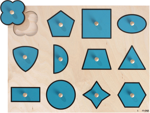 Съдържание / материали: Дървена фурнирована табла с отвори за вгнездяване на геометрични форми. Геометричните фигури (12 бр.) са с малки дръжки за по-лесен захват и маркировка, показваща правилното им поставяне в отворите на таблата.