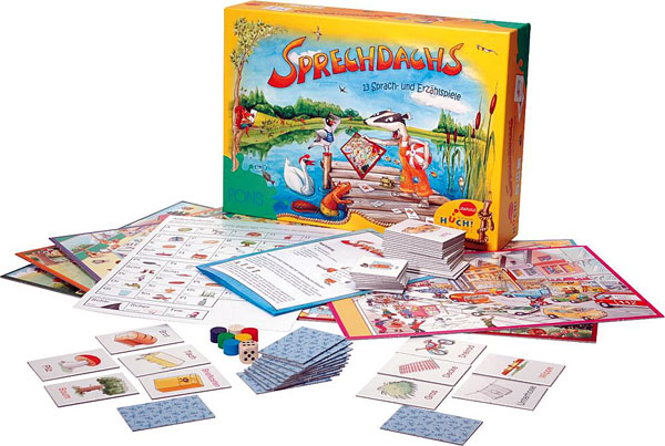 Съдържание/ материал: 13 говорни и разказвателни игри за максимум 6 играчи на 5 години и повече, 6 детайлни картини, 120 карти с картинки, 1 табло с азбуката (латиница), 9 карти с предлози, инструкции, 1 зарче, 6 пешки