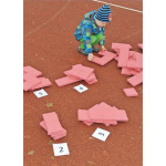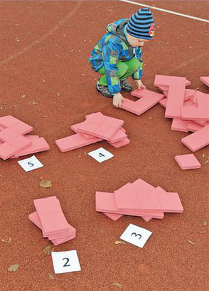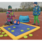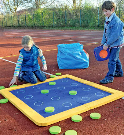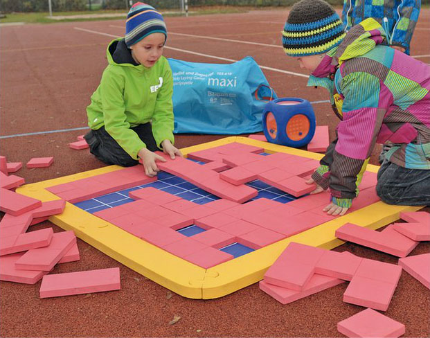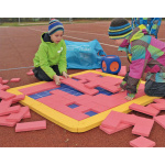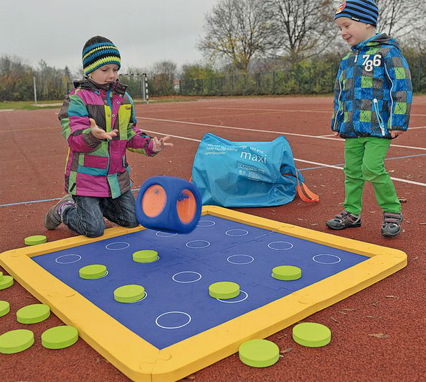 Занимателна и образователна игра за навън. Показанията на щурото зарче определят кой елемент трябва да се постави в рамката. Малко по малко игралното поле се запълва. Започва да става по-трудно, защото трябва да се намери правилната позиция на всеки елемент, така че да няма празни позиции между тях в рамката. Обратната страна на игралното поле предлага друг вариант на играта, в който шайбите първоначално трябва да се подредят според приложените модели. След това те трябва да бъдат придвижвани по полето. При всеки ход се получават нови конфигурации между шайбите, което прави играта особено интересна. Игралното поле е с размери 100х100 см, а всяка отделна клетка – 10х10 см. Освен за забавление играта може да се използва и с образователна цел. Тя развива визуалните възприятия, пространствената ориентация, концентрацията, играта в група и спазването на ред. Докато играта, децата се запознават с базови математически понятия, които ще са им нужни в бъдеще. В комплекта са включени подробни указания за играта. Подходяща е за индивидуални и групови занимания.