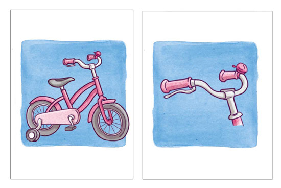 перо – птица – люспи – риба – лист – дърво – цвят – цвете – перла/мънисто – гердан – страница – книга – шнур – хвърчило – дръжка – кофа – платно – платноходка – комин – локомотив – кормило – велосипед – крило – самолет – кофа/лопата – багер – колан – халат за баня – цип – яке – копче – риза – връзка за обувки – обувка – презрамка – чанта – дръжка – чадър – дръжка за очила – очила – дръжка/брава – врата – парапет/перило – стълбище – стъкло за прозорец – прозорец – тухла – стена