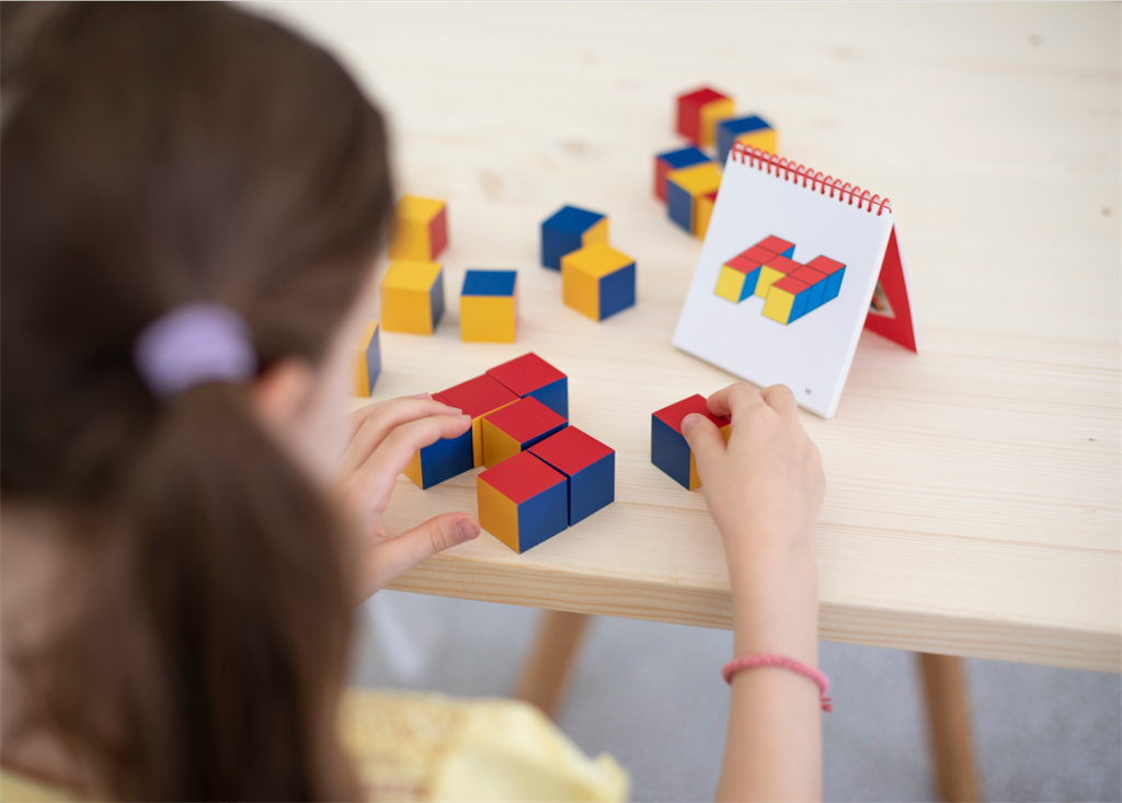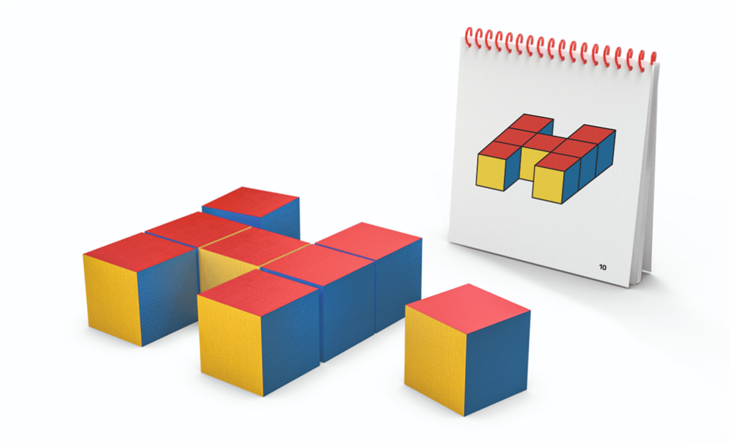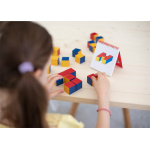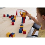 Съдържание/материали: 27 дървени кубчета с червени, бели и жълти страни + брошура с 47 примерни модели, които градират