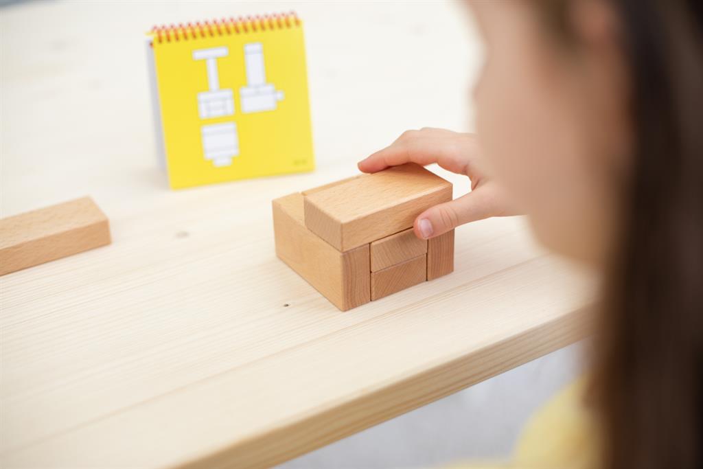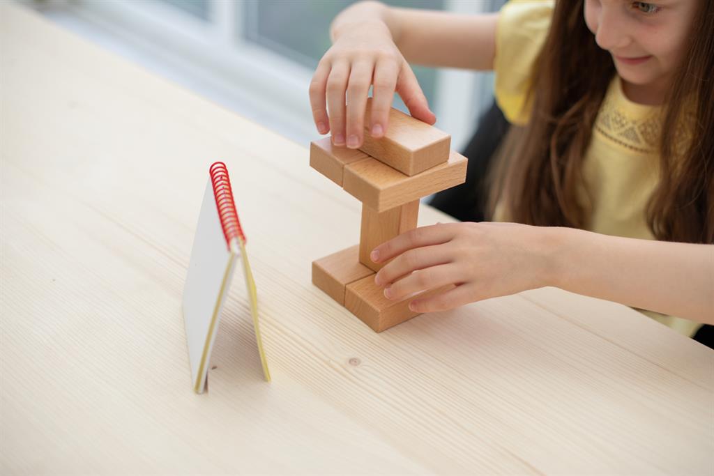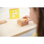 Съдържание: 8 дървени блокчета (8х4х2 см), книжка с модели
