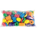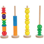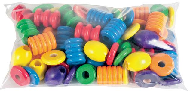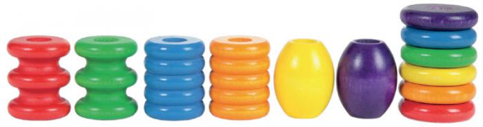 Опаковка с 72 дървени мъниста в цветове на дъгата – с голям отвор за по-лесно нанизване от малки деца.