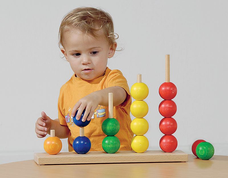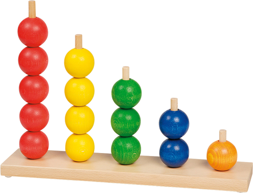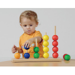 Съдържание / материали / размери: Дъска с 5 поставки за нанизване, изработена от масивна дървесина с лаково покритие (41,5х9х28 см); 15 цветни дървени топки (Ø 5 см)