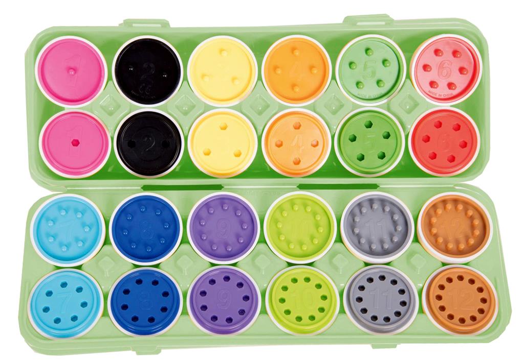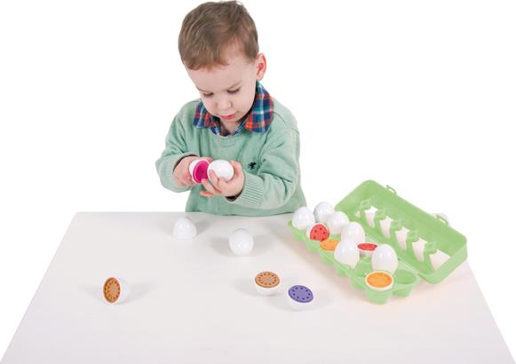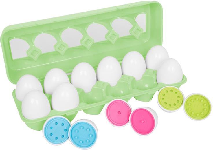 Мемори игра, която помага на децата да научат цветовете, да броят и да тренират паметта си. Пластмасова кутия, пълна с яйца, които отвън изглеждат напълно еднакви, но когато бъдат отворени, всички са различни по цвят, има изобразени цифри и съответстващото им количество отвори. Освен за тренировка на ума и фината моторика, могат да бъдат използвани и за ролеви игри. Защо да не поиграем на магазин?