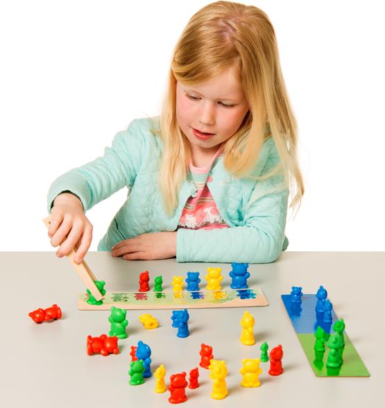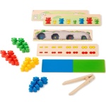 Игра за броене и сортиране по цвят и големина. Поставете мечетата с еднакъв цвят и размер пред картата със задание. Използвайте пинсетата, за да развиете фината моторика.