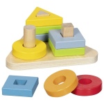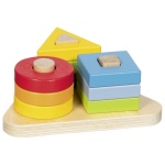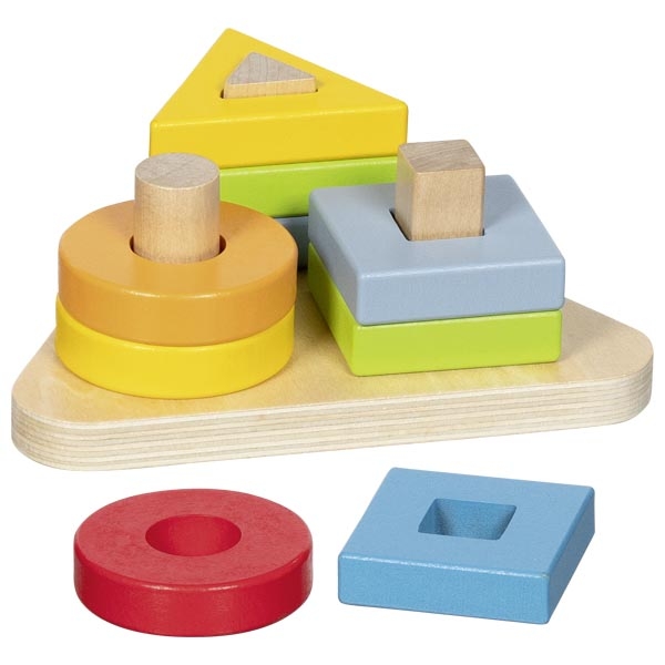Съдържание: Дървена основа, 9 дървени елемента за подреждане по форма и цвят