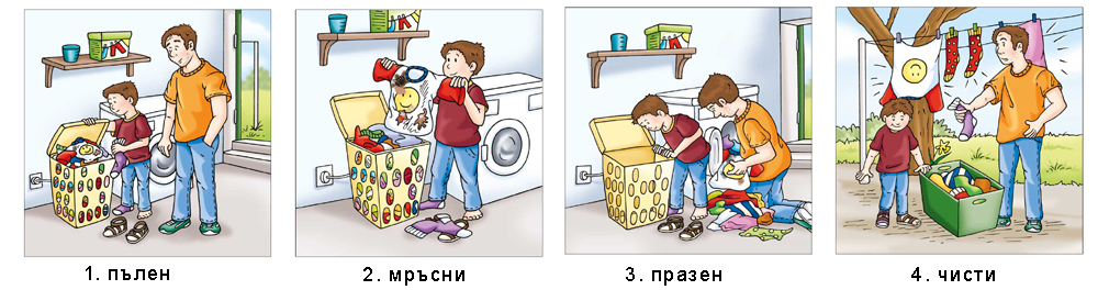Илюстрираните истории учат децата как да описват обекти и дейности, като използват прилагателни имена. Специално внимание е отделено на употребата на антоними (напр. тъжен – щастлив, бърз – бавен, светъл – тъмен).