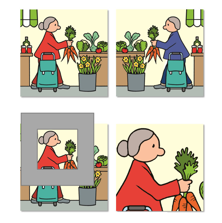 Съдържание: 72 карти, представящи 12 ежедневни ситуации (по 1 с фигура на жена и на мъж, ориентирани огледално една спрямо друга) и 48 карти с части от изображенията • 1 шаблон • инструкции на български език