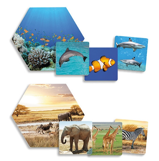 1. Всички карти се поставят с лице нагоре – децата заедно търсят и съчетават животните с правилните местообитания.