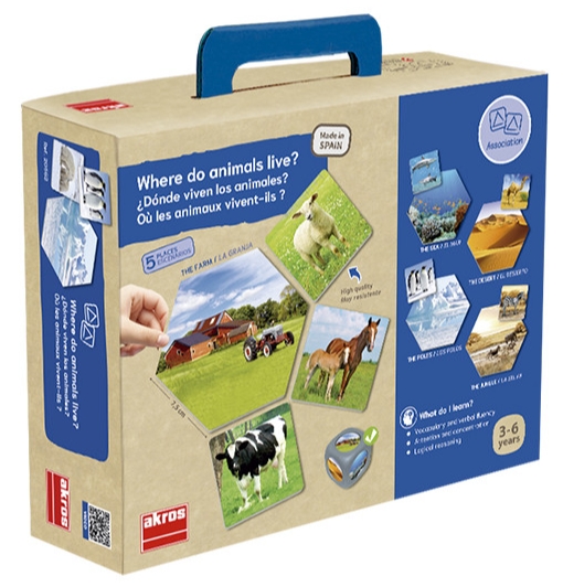 Къде живеят животните? e асоциативна образователна игра, която учи децата да разпознават и свързват животните с техните естествени местообитания. Чрез интерактивно сортиране и забавен игрови подход, децата ще научат къде живеят различните животни – на фермата, в джунглата, в пустинята, на полюсите или в морето.