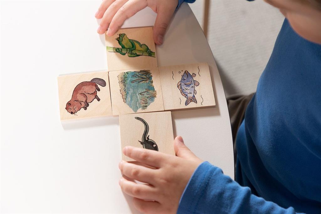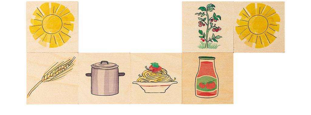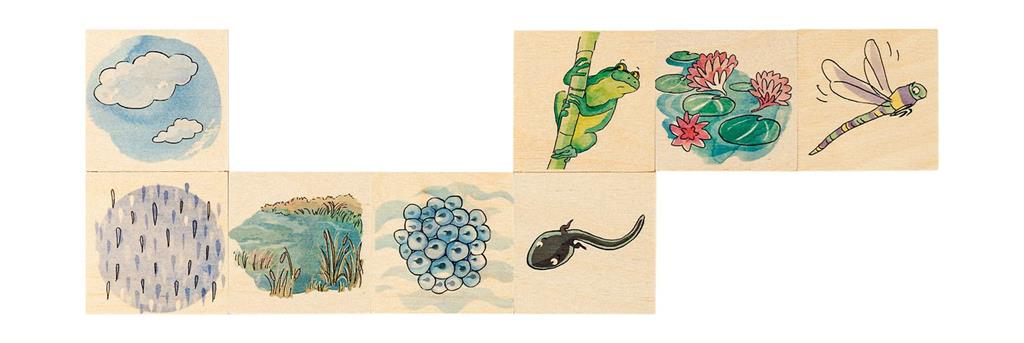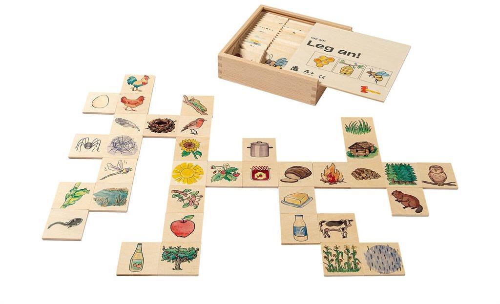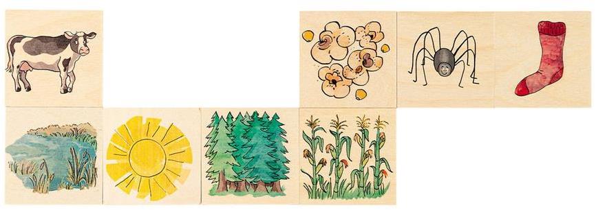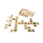 Съдържание / материали / размери: 70 дървени плочки с картинки (5,4×5,4×0,5 см). Съхраняват се в дървена кутия с плъзгащ се капак (21x27x5 см)