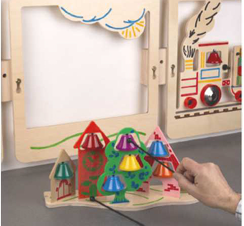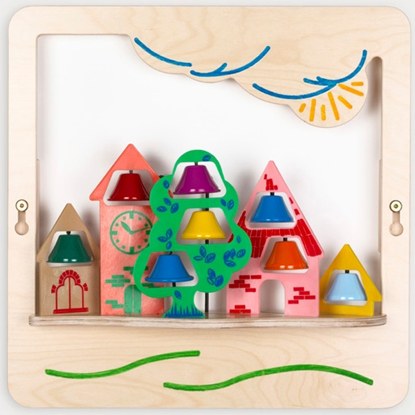 Музикален стенен панел за игра. Поставката с камбанките може да се сваля и да се използва отделно. Панелът може да се използва самостоятелно или в комбинация с другите музикални стенни панели от серията.