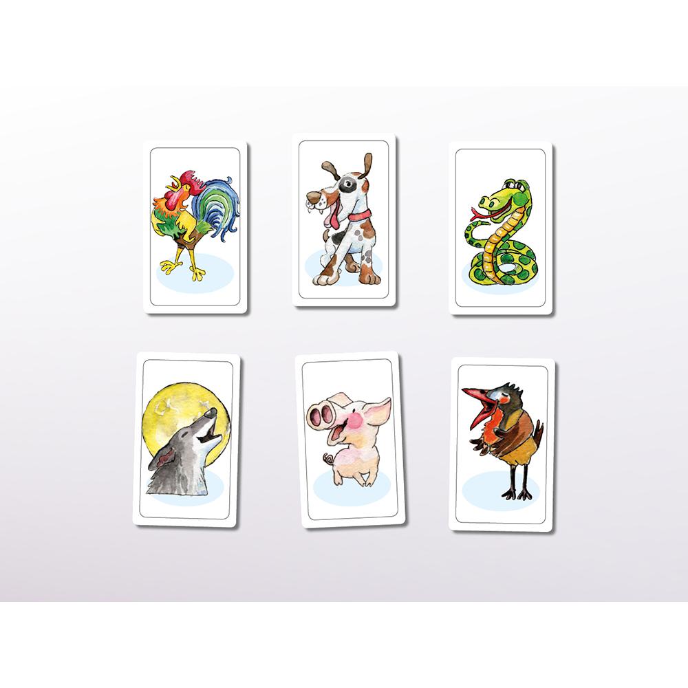 Първият участник обръща най-горната от купчинката карти с изобразени много животни, последователно имитира характерния звук на всяко от тях и пак я обръща с картинката надолу. Запаметявайки звуците, играчите търсят сред своите карти животното, което смятат, че е сред имитираните по-рано. Ако го намерят, трябва да поставят картата на масата с картинката, сочеща нагоре.