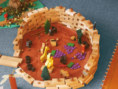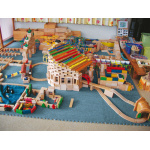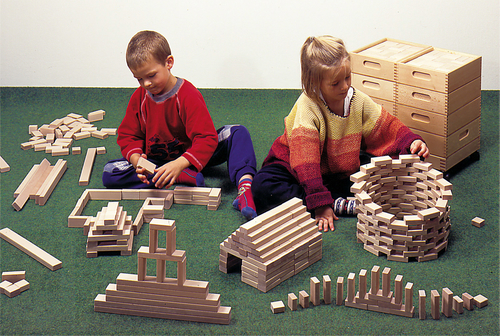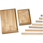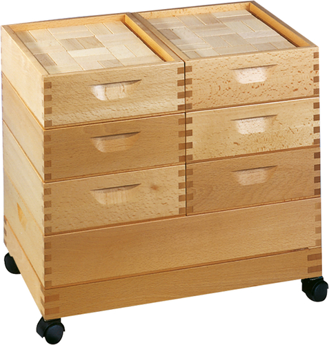 Съдържание/ материали: 6 дървени кутии с дървени строителни блокчета УЛ и Строител УЛ ПЛЮС, поставени върху основа на колелца. Въпреки че тежи приблизително 30 кг, всяко дете може безпроблемно да мести количката. Размери: 47х30х47 см