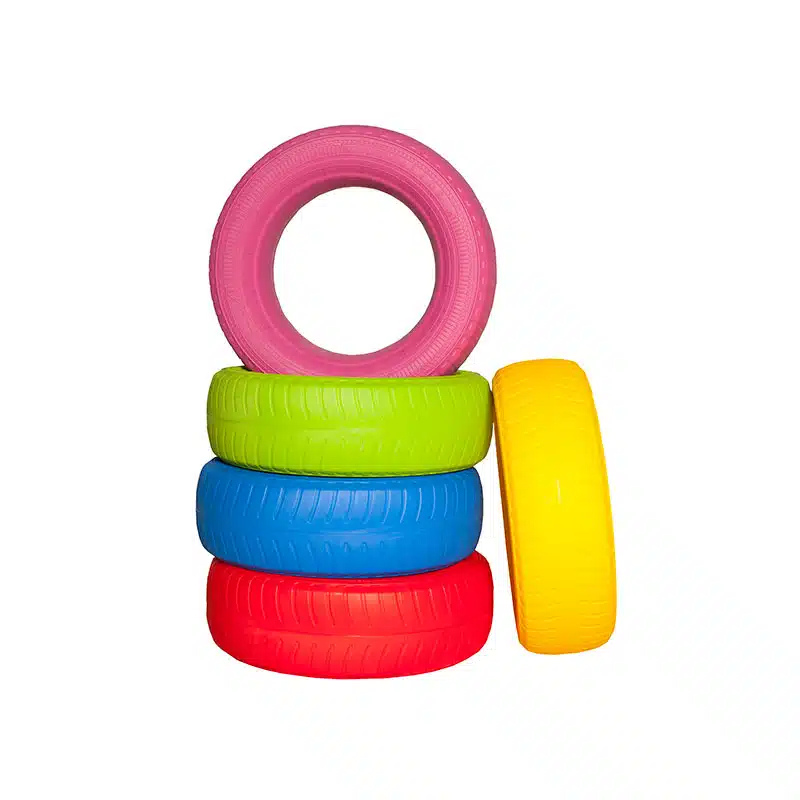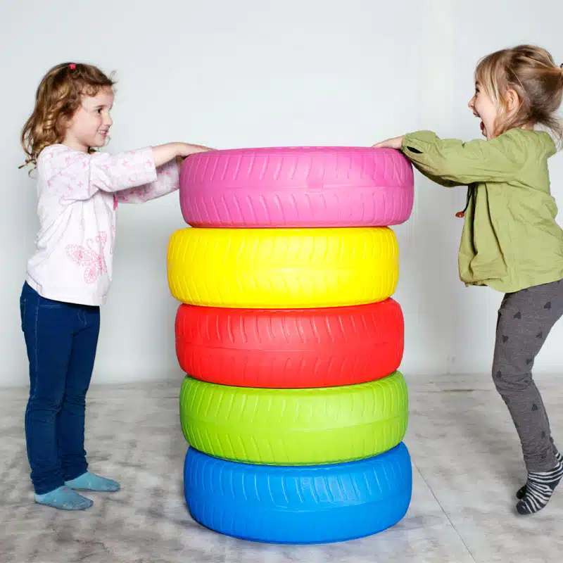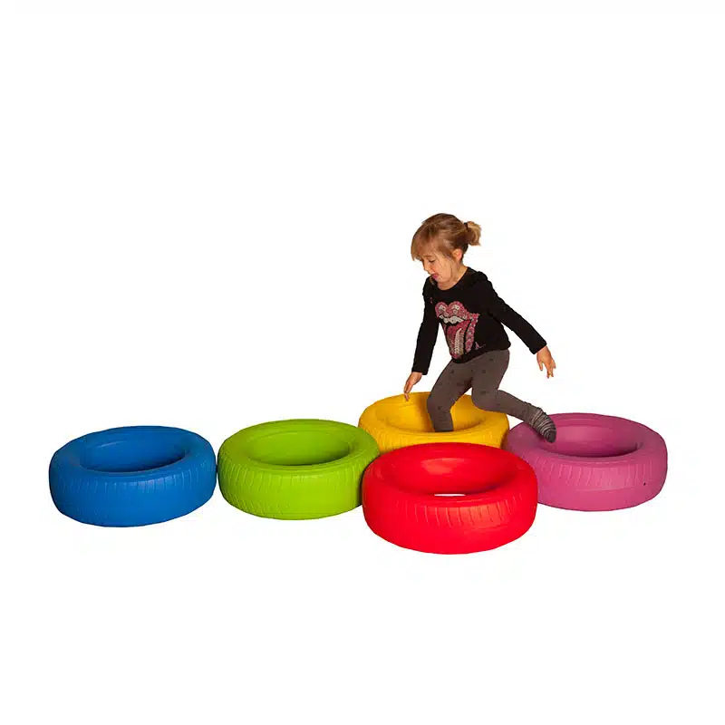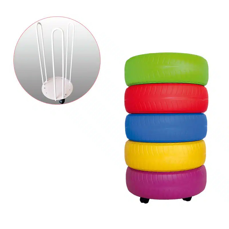Комплект 5 цветни игрални гуми с количка за съхранение е забавно и практично решение за детски градини, училища, сензорни и терапевтични зали. Големите, меки гуми могат да се използват за сядане, катерене, игри за баланс и двигателни активности. Ярките им цветове стимулират въображението и сетивното развитие на децата, а количката с колелца осигурява лесно пренасяне и подреждане.