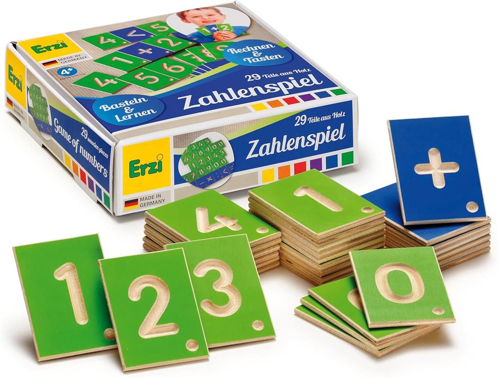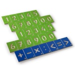 Съдържание: 29 цветни дървени плочки (2 x цифри от 0 до 10 и 1 x знаци +, –, ×, :, )