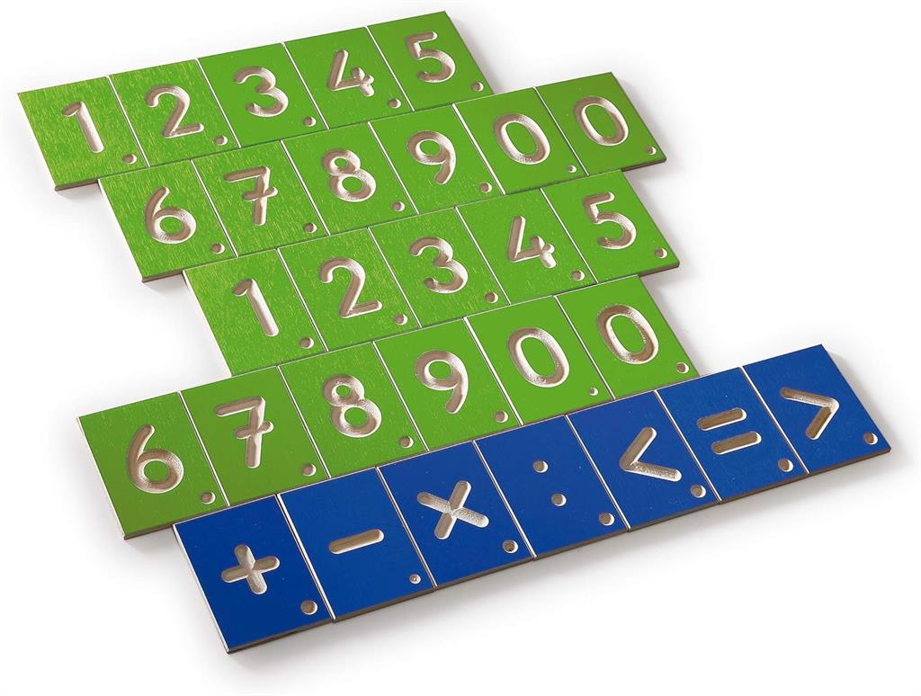 Комплект Математика – Дървени плочки с цифри и знаци за писане и смятане е образователна игра, която подпомага усвояването на основни математически умения по сензорен и занимателен начин. Всяка от дървените плочки съдържа вдлъбнати символи – цифри или знаци – които могат да се проследяват с пръст или молив. Това стимулира фината моторика, визуално-моторната координация и графомоторните умения, необходими за писане и решаване на задачи.