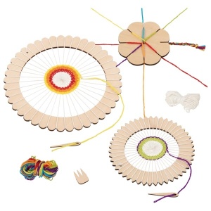 Съдържание: 2 кръгли дървени рамки за тъкане, дървен елемент за плетене тип „цвете“, нишки за тъкане и плетене, аксесоари за работа