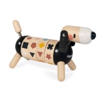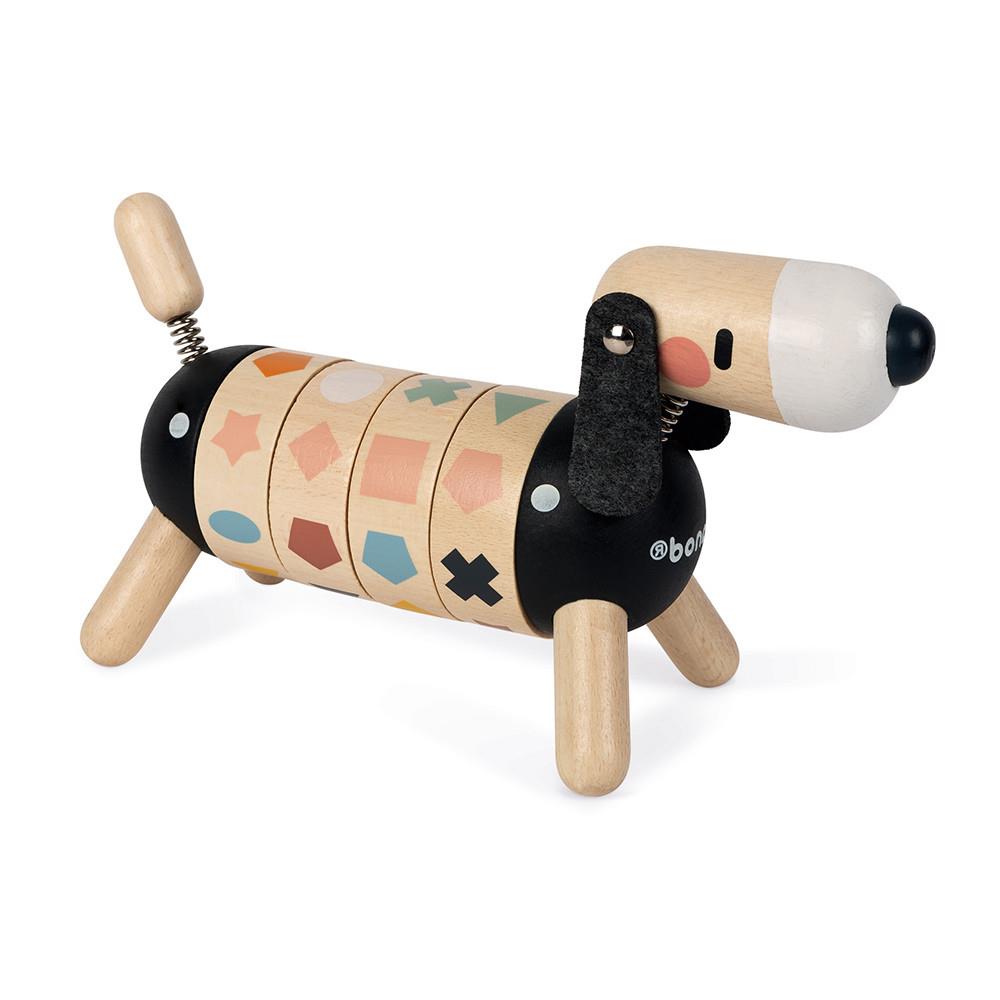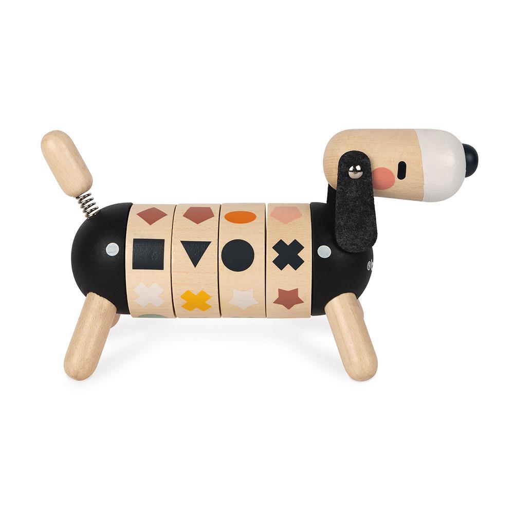Очарователно дървено куче, с чиято помощ децата ще опознаят цветовете и формите. Играта има 2 нива. В първото колелата на корема трябва да завъртят така, че да се наредят еднакви форми, а на второто – еднакви цветове. Наред с това кученцето е и красив декоративен предмет, който няма да искате да приберете, когато времето за игра свърши! Толкова е сладко с малката си удължена глава, филцови уши и пружинираща опашка!