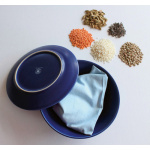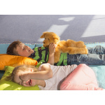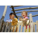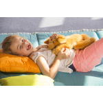 Материал: синтетични влакна (85% акрил, 10% полиестер) с пълнеж от гранули в лапите. Пере се при 40°C. Включва бяла торбичка с пластмасов гранулат и синя торбичка за индивидуално пълнене