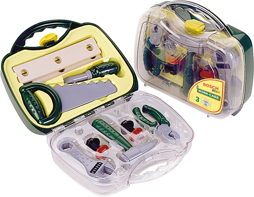 Съдържание / материал: чук, клещи, отвертка, трион, френски ключ, 2 винта с гайки и 2 лайсни, куфарче, всички от пластмаса