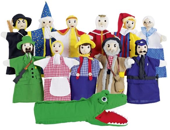 Комплект от 12 кукли за ръка с дървени глави. Отличен набор за куклен театър. Височина на куклите: ок. 26 см