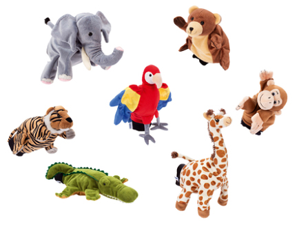 Комплект кукли за ръка, управляват се с пет пръста. Материал: памук (плюш), полиестерен пълнеж, ръчно пране Размери: приблизително 22 см Съдържание: 7 кукли (маймуна, тигър, слон, жираф, крокодил, папагал и мечка)